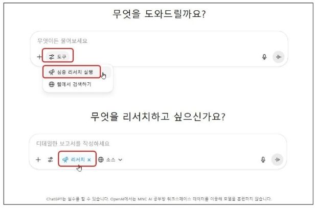 사용해 보시려면, 프롬프트 입력창 하단의 [도구] 메뉴를 펼쳐서 [심층 리서치 실행] 옵션을 꼭 켜고(파랗게 활성화되는지 확인하고) 작업하세요.